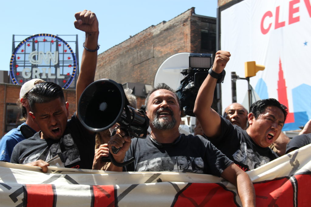 Using a combination of banners and brick wall-patterned costumes, activists surrounded the Quicken Loans Arena for about two-and-a-half hours to highlight the harm caused by the GOP nominee’s immigration policies.
